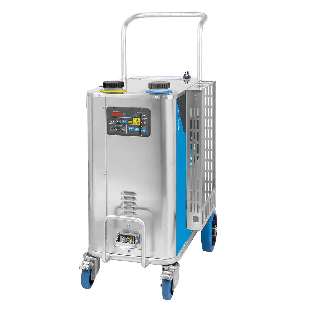 Parni čistilnik z ohišjem in kotlom iz nerjavečega jekla (inox), zasnovan za zahtevno industrijsko uporabo. Naprava je sposobna proizvajati suho nasičeno paro pri temperaturi 183 °C.