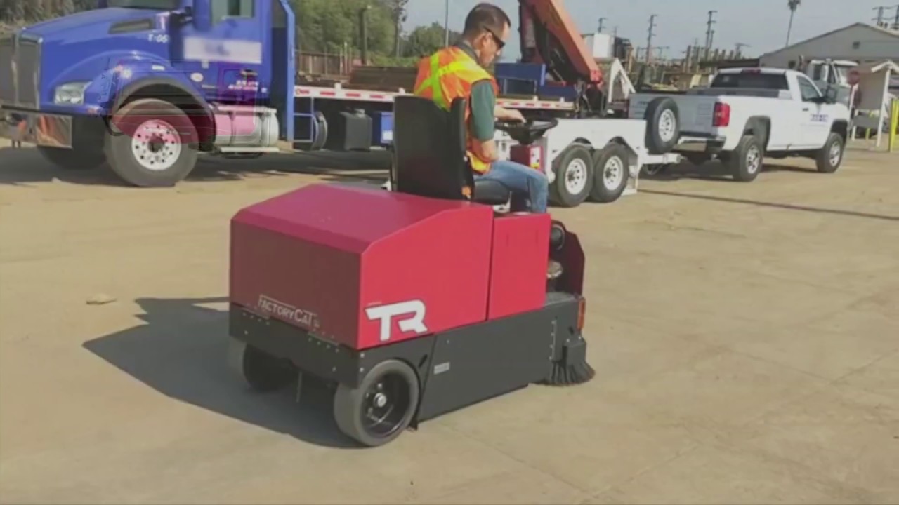 Industrijski stroj za pometanje tal podjetja Factory Cat lahko naenkrat pobere cele vreče cementa, ne da bi pustil sledi prahu.